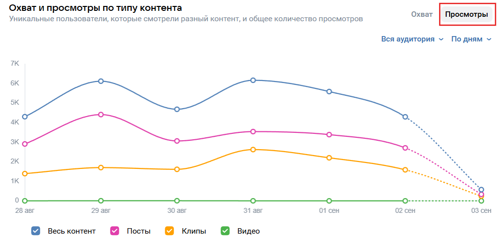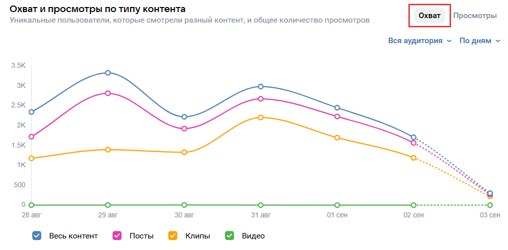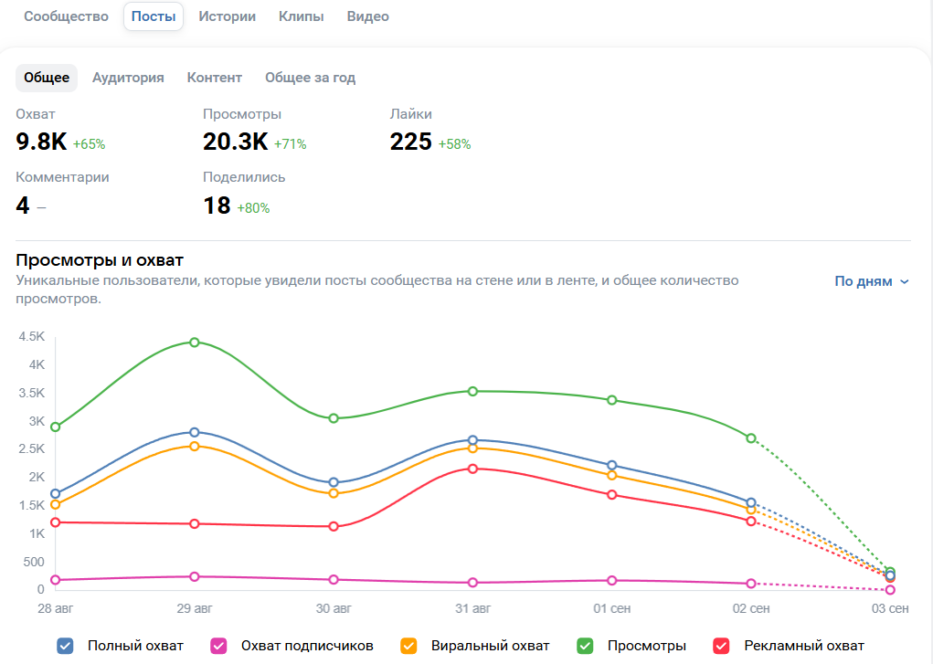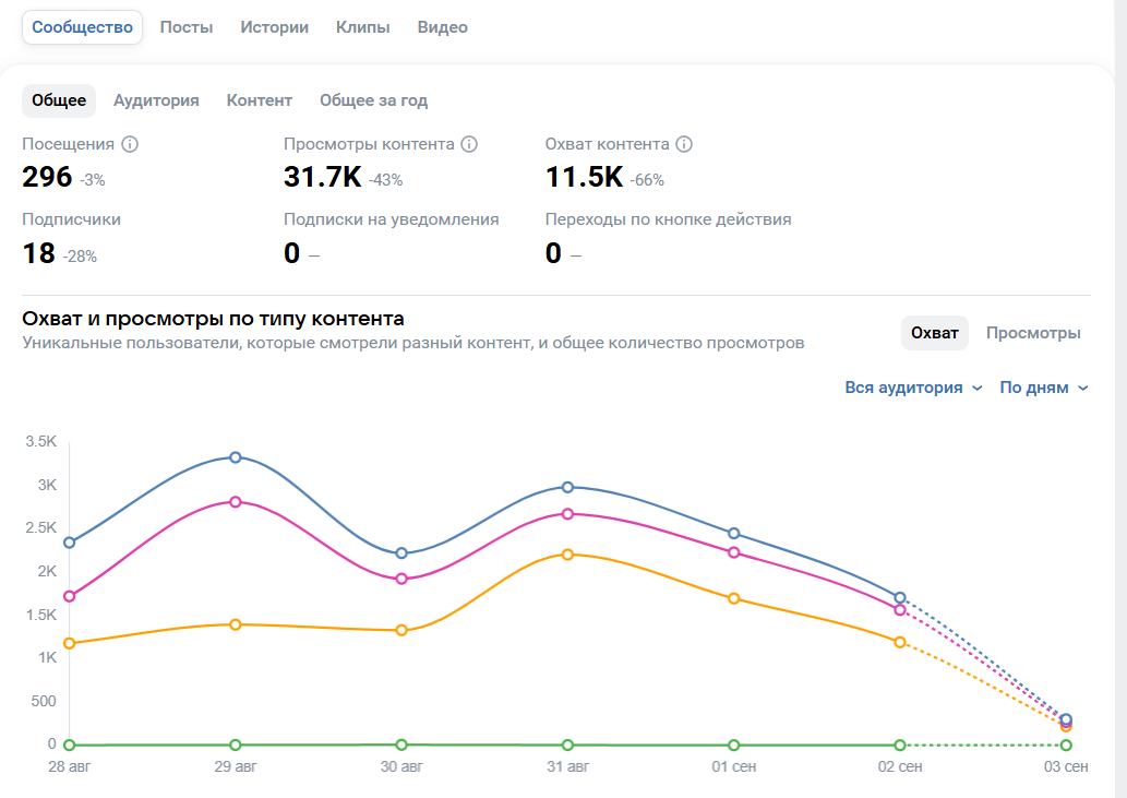 Questa metrica mostra quante volte è stata aperta la pagina della comunità. Una persona può generare diverse visualizzazioni. Qui è più importante non tanto il numero, quanto la profondità: si dividono le visualizzazioni per i visitatori unici e si guarda quanto il pubblico si immerge nel contenuto. Se il coefficiente è inferiore a 1,3, significa che le persone entrano e subito escono. Un livello normale è intorno a 1,5-2. Se è superiore, è un buon segno: le persone sono interessate, sfogliano, esplorano, si fermano.