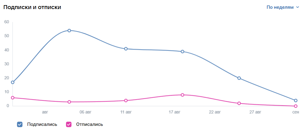 Questo è il blocco più importante, si trova nella sezione "Generale" nella "Comunità". I grafici mostrano la dinamica delle iscrizioni, disiscrizioni e incremento netto. Qui è utile guardare non solo i numeri, ma anche a cosa sono legati. Crescita improvvisa? Probabilmente c'è stata pubblicità o un post virale. Picco di disiscrizioni? Forse si è esagerato con le vendite o si è fatto un'invio non riuscito.
