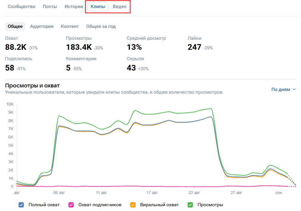 Questo è molto utile per esperimenti con i formati. Può rivelarsi che i clip ottengono copertura, ma coinvolgono poco, mentre i video lunghi, al contrario, generano più commenti e discussioni. Allora puoi correggere la strategia: parte del contenuto può essere creata per la copertura, parte per il coinvolgimento.