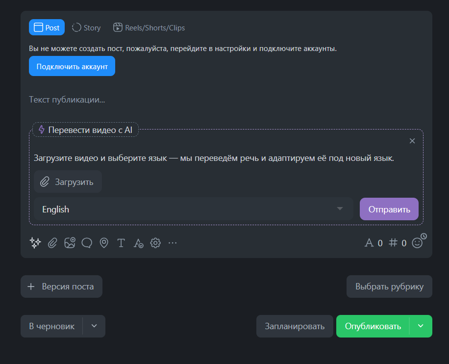 Nel 2026, uno strumento SMM standard non è solo la pianificazione dei post, ma anche l'adattamento automatico dei video per diversi mercati e lingue - direttamente all'interno del servizio. Nel nuovo aggiornamento, Postmypost ha aggiunto una funzionalità che consente, grazie all'AI, di tradurre video nella lingua desiderata letteralmente in pochi clic: