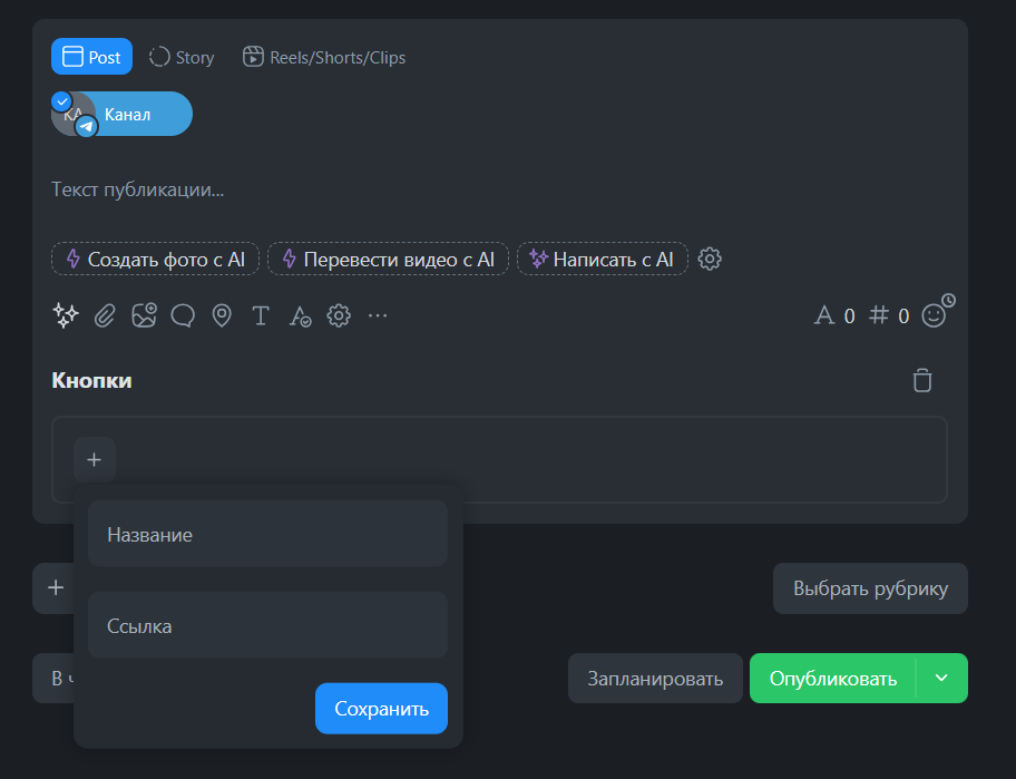 Hack della vita: usa l'assistente AI all'interno del servizio. Basta scrivere in chat con la rete neurale "suggerisci 5 varianti di pulsanti per vendere un corso online di SMM" — e riceverai testi pronti con emoji.