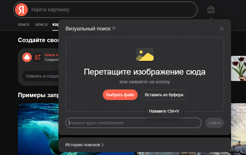 Apri yandex.ru/images. Nella barra di ricerca clicca sul pulsante con l'icona della fotocamera. Scegli uno dei tre opzioni: