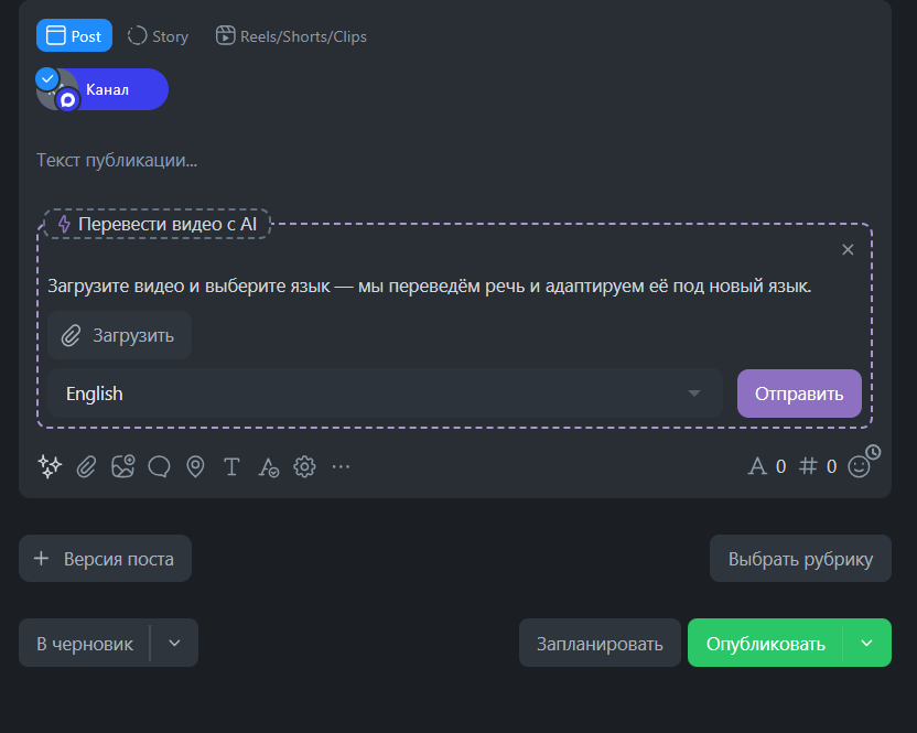 Immagina: hai trovato un ottimo testo sul marketing e vuoi adattarlo per il pubblico russo. Oppure hai un video virale estero che andrà a ruba su TikTok / VK Clips russi. Prima carichi il materiale (testo o video) su Postmypost, ottieni la traduzione e poi rifinisci con un prompt — e il contenuto è pronto per la pubblicazione.