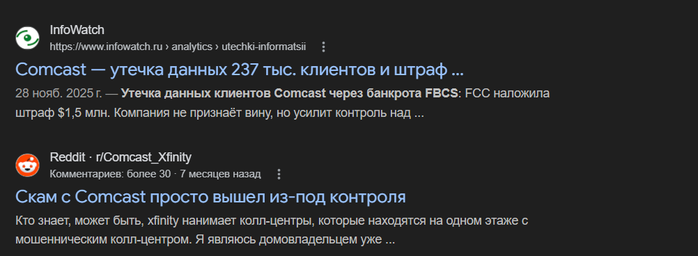 Comcast — affronta regolarmente scandali a causa della qualità estremamente bassa del servizio clienti, delle difficoltà nell'annullamento delle iscrizioni e dei prezzi elevati, che portano a una fuga di utenti verso i concorrenti. La reputazione dell'azienda è minata da fughe di dati, cause legali e dure critiche. Una volta un agente ha impiegato 20 minuti non solo a non permettere all'utente di annullare l'iscrizione, ma anche a manipolare e maltrattare. La registrazione è diventata virale, e la reputazione negativa dell'azienda si è consolidata per anni.
