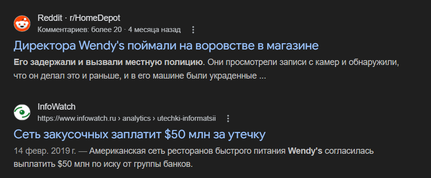 La catena di fast food Wendy's ha affrontato anche una serie di scandali, tra cui cause per discriminazione, accuse di pubblicità ingannevole (i hamburger nelle foto sembrano più grandi di quelli reali) e boicottaggi a causa delle condizioni di lavoro. Inoltre, nella storia dell'azienda ci sono stati problemi che hanno portato all'uscita dalla Russia e alla chiusura di centinaia di punti in perdita.