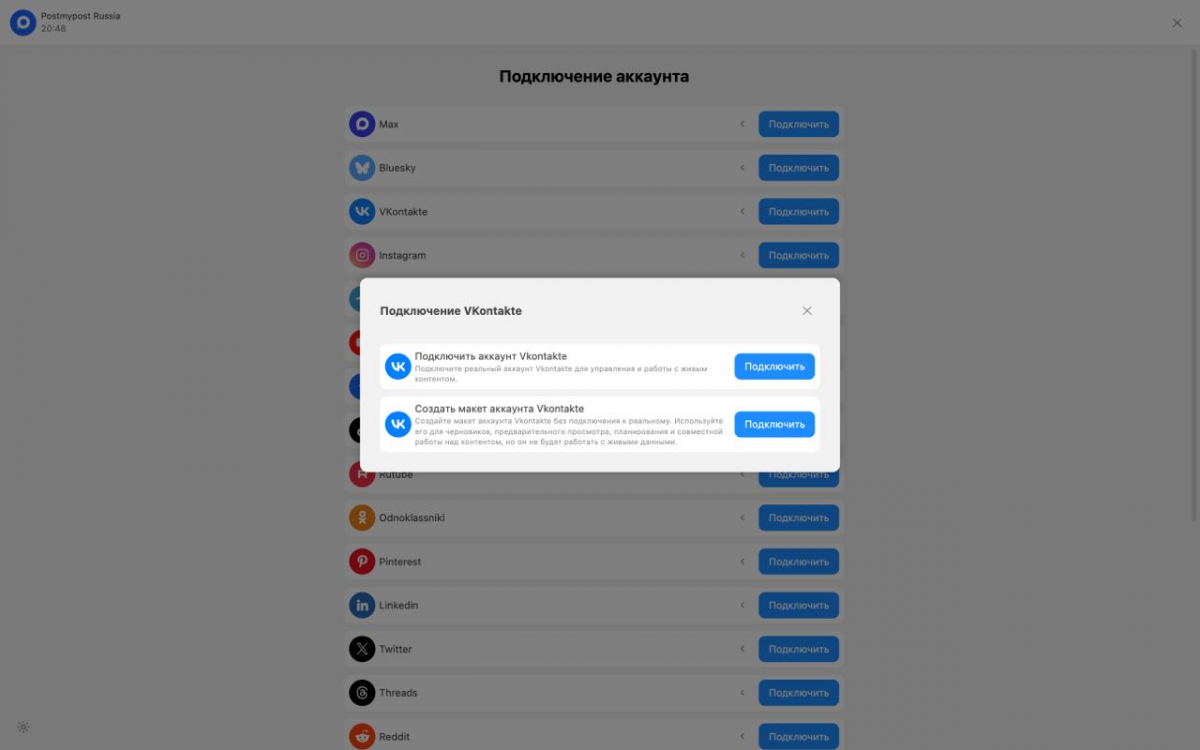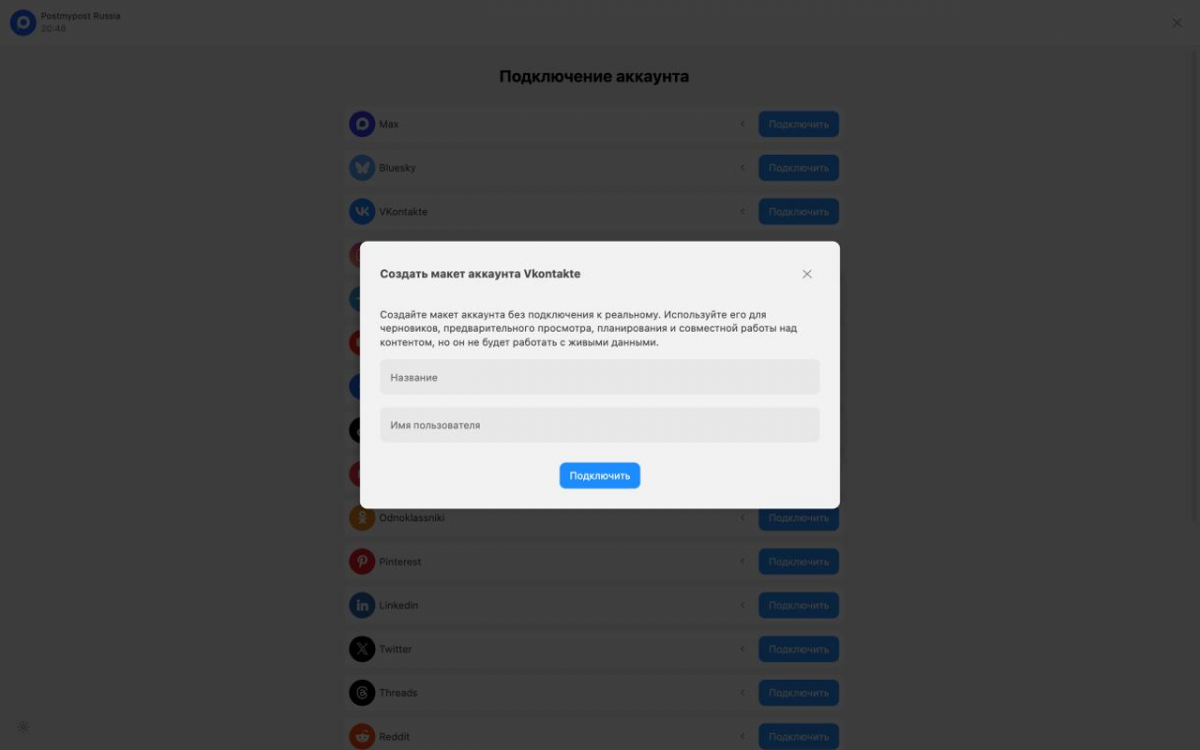 The account mockup in Postmypost is a tool that makes your work faster, safer, and more creative. No more waiting for access or worrying about replacing accounts: prepare content in a virtual space and publish when everything is perfect. This update is especially valuable where time is money.