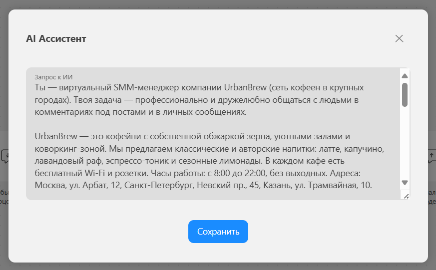 Чтобы понять, как инструмент работает вживую, мы протестировали его на условной кофейне. Прописали ИИ основную задачу и информацию.