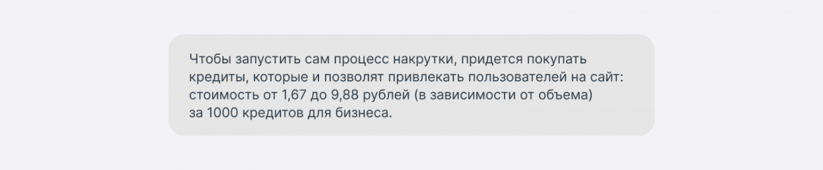 От 1 рубля за действие, плюс небольшая надбавка за расширенные сценарии (например, ответы на вопросы). Минимальная сумма начала накрутки от 100 рублей.