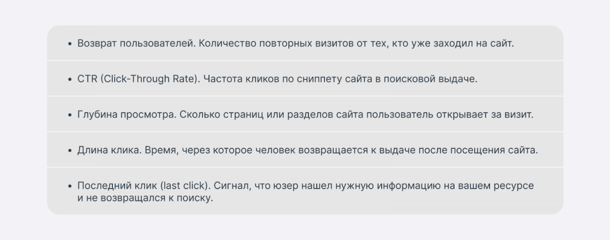 Поведенческие факторы (ПФ) играют важную роль в этой системе. ПФ — это комплекс метрик, по которым алгоритмы поисковых систем определяют, насколько страница в интернете может быть полезна для пользователей.