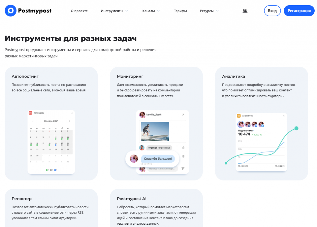 Postmypost умеет и гораздо больше. В 2026 году это полноценная экосистема для SMM и клиентского сервиса: